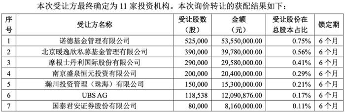 受让方最终确定为11家投资机构,排名第一的为诺德基金,共受让52.5万股,金额5355万元。诺德基金成立于2006年,截至2024年12月31日,公司超160人的团队管理超700亿元资产。